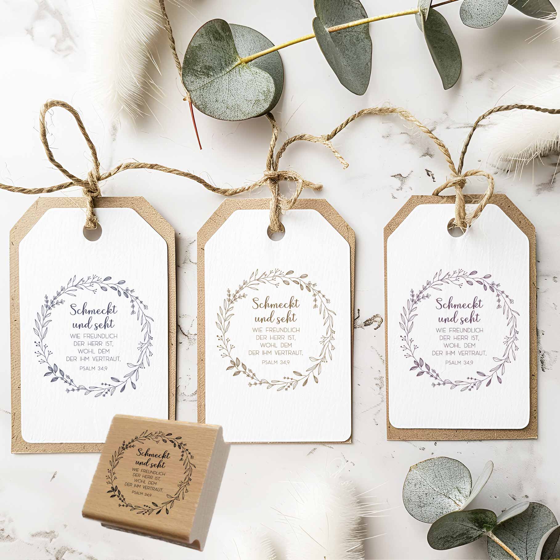 Hochwertiger Bibelvers-Stempel mit Psalm 34,9 „Schmeckt und seht, wie freundlich der Herr ist“. Erhältlich als Holzstempel, Selbstfärber oder reines Stempelgummi – ideal für Bibel Journaling, Karten und christliche Geschenke.