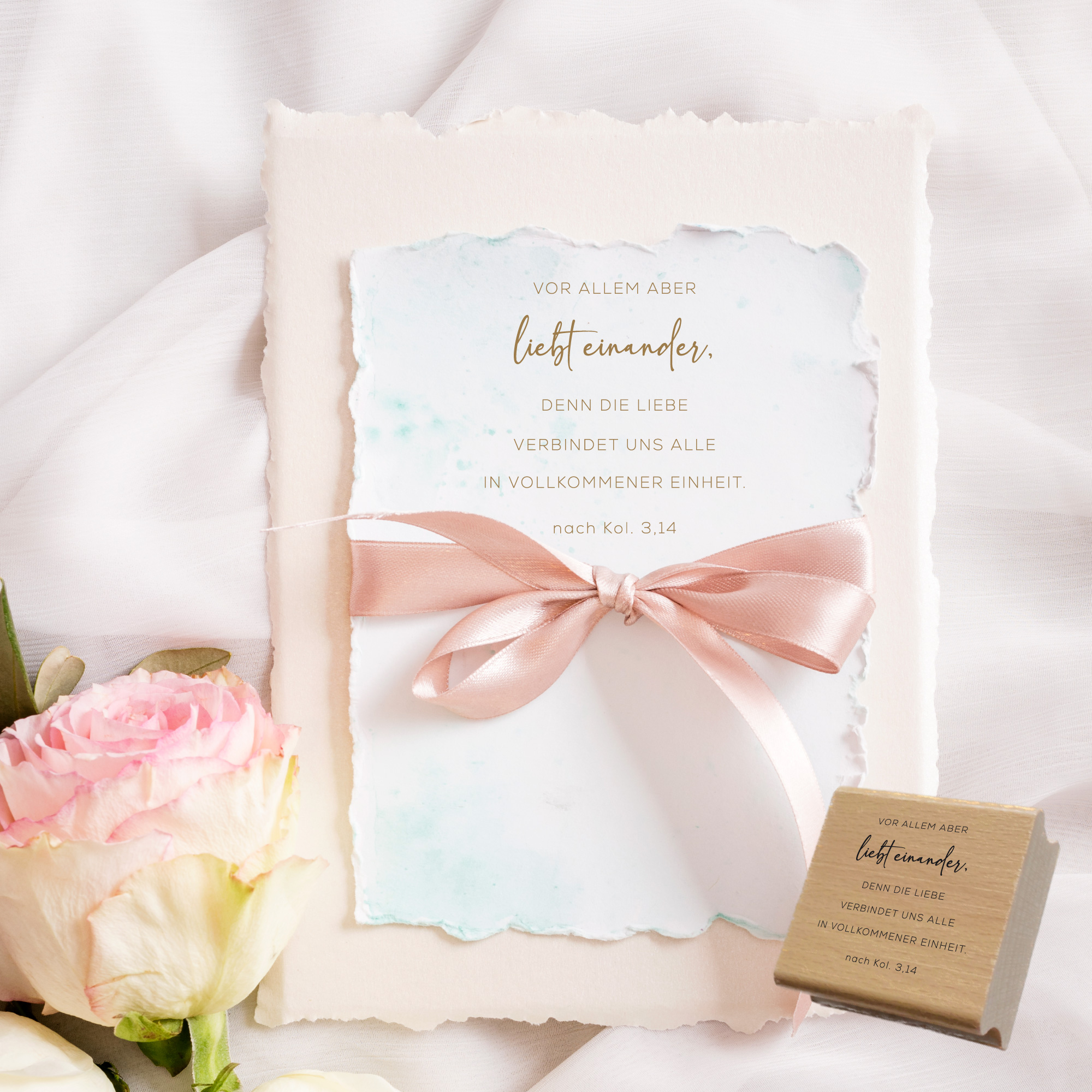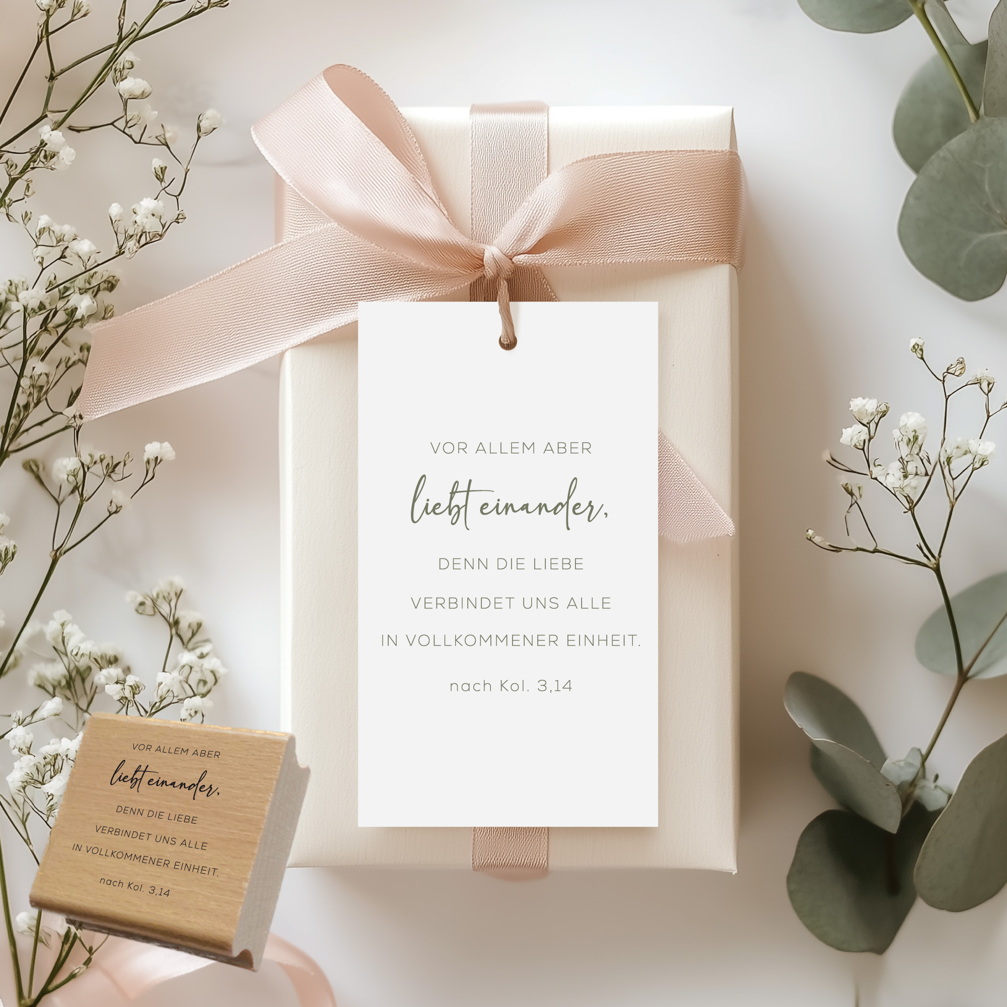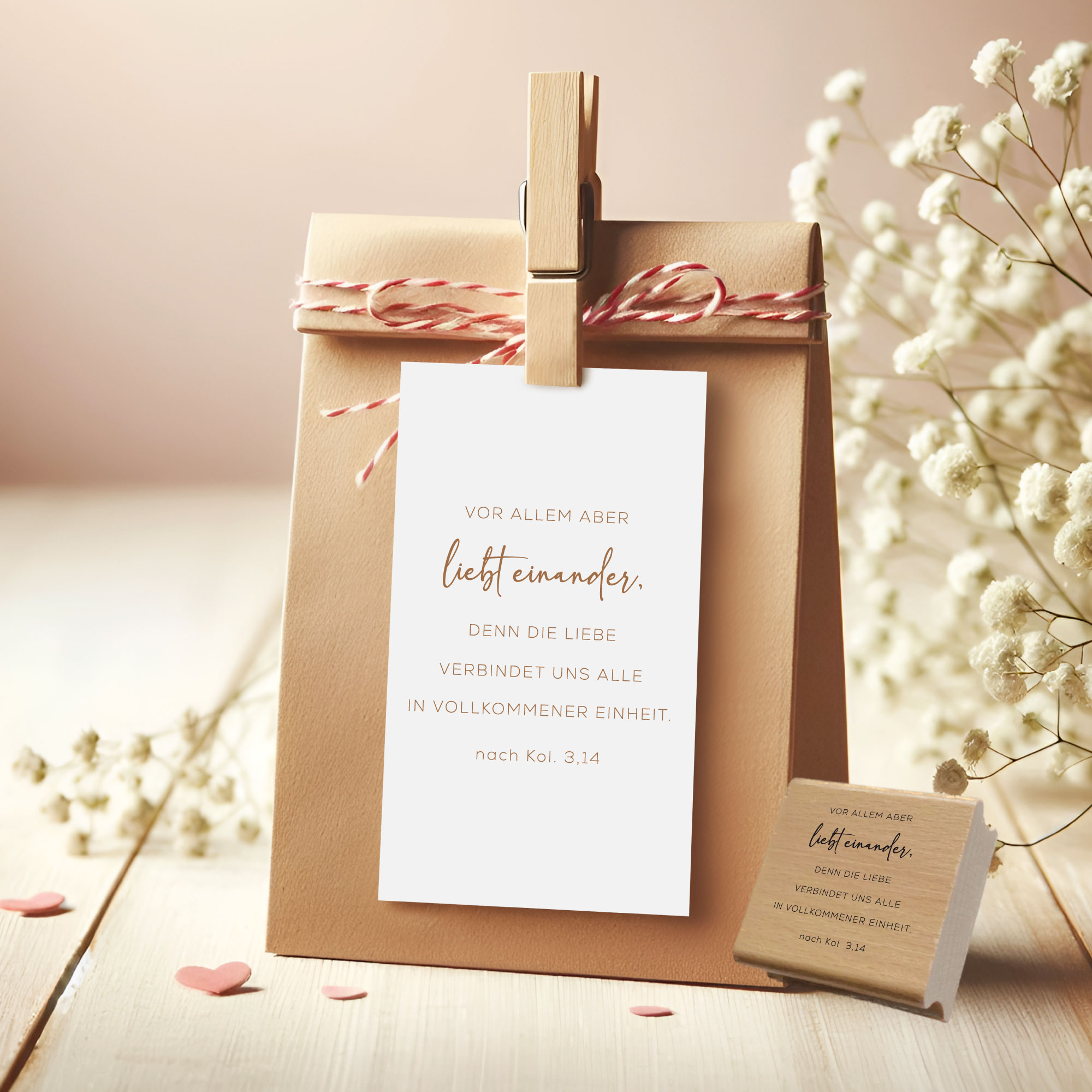 Verbreite Liebe mit unserem Bibelvers-Stempel nach Kolosser 3,14:„Vor allem aber liebt einander, denn die Liebe verbindet uns alle in vollkommener Einheit.“