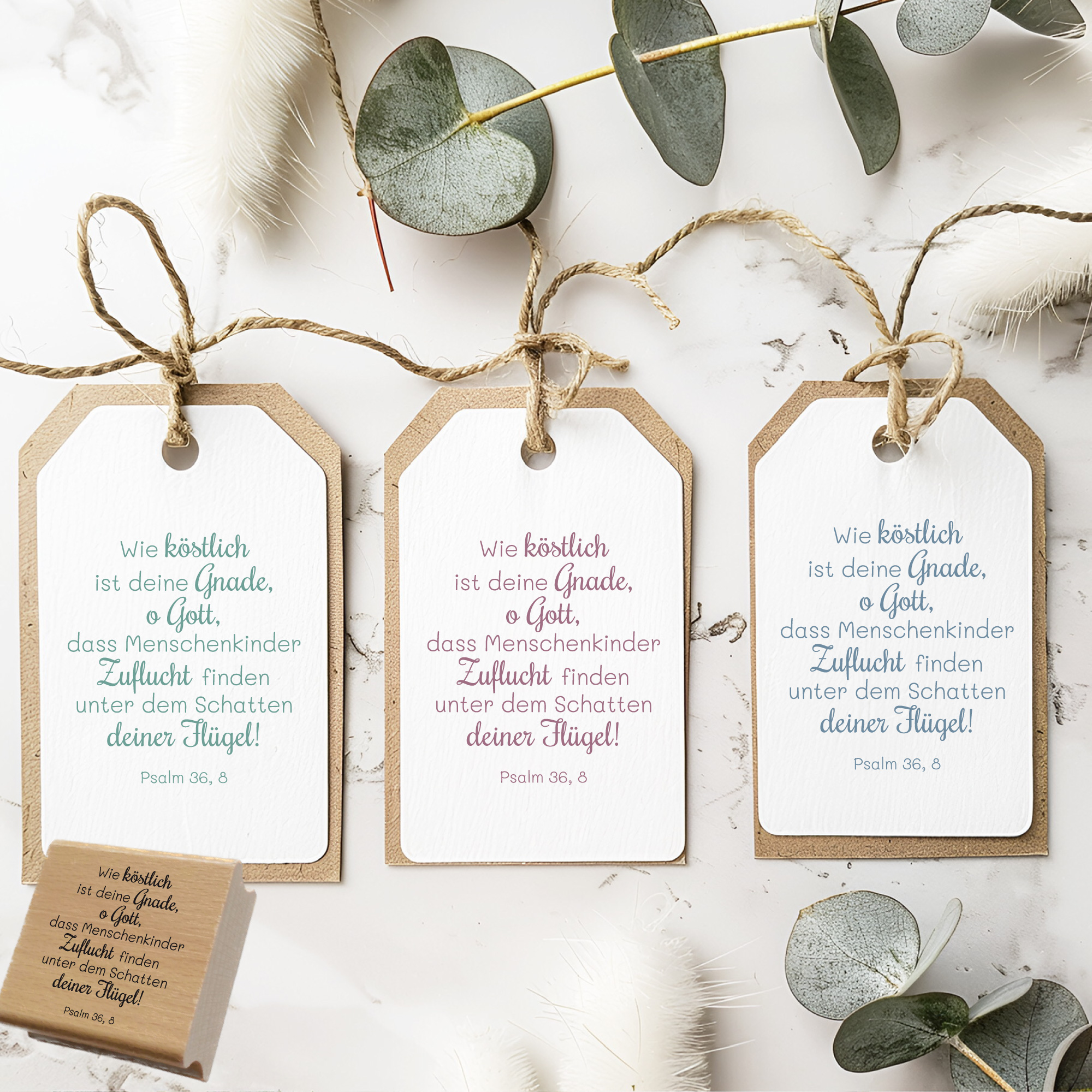 Der Bibelvers-Stempel Psalm 36,8 erinnert an Gottes Nähe, Schutz und liebevolle Gnade: „Wie köstlich ist deine Gnade, o Gott, dass Menschenkinder Zuflucht finden unter dem Schatten deiner Flügel.“