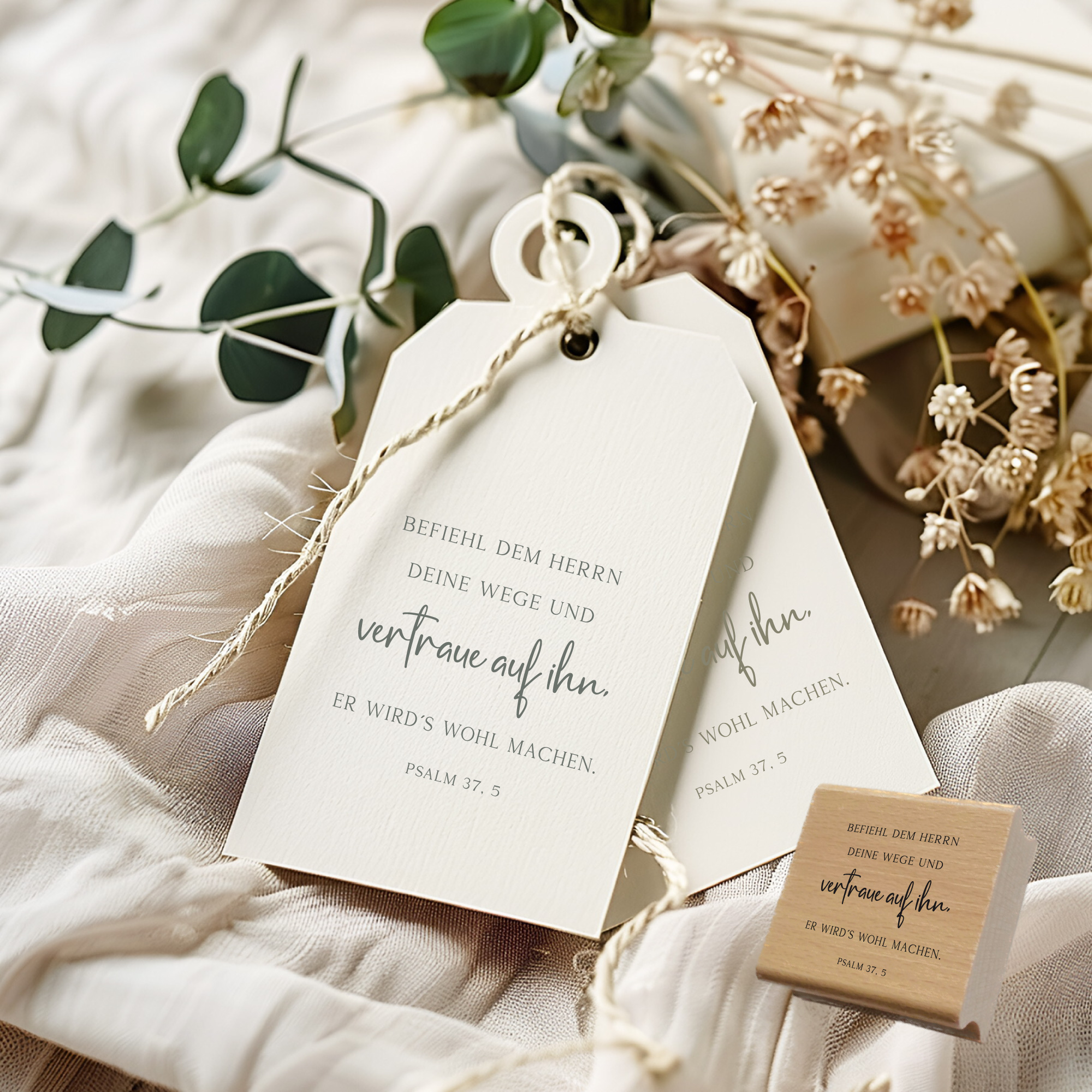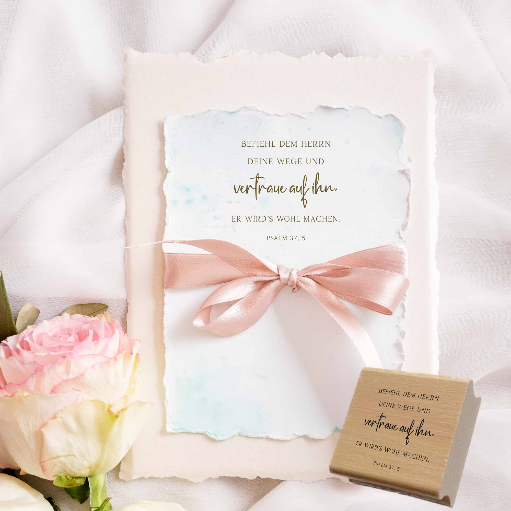 Der Bibelvers-Stempel Psalm 37,5 ermutigt dazu, das Leben vertrauensvoll in Gottes Hände zu legen: „Befiehl dem Herrn deine Wege und vertraue auf ihn, er wird es wohl machen.“