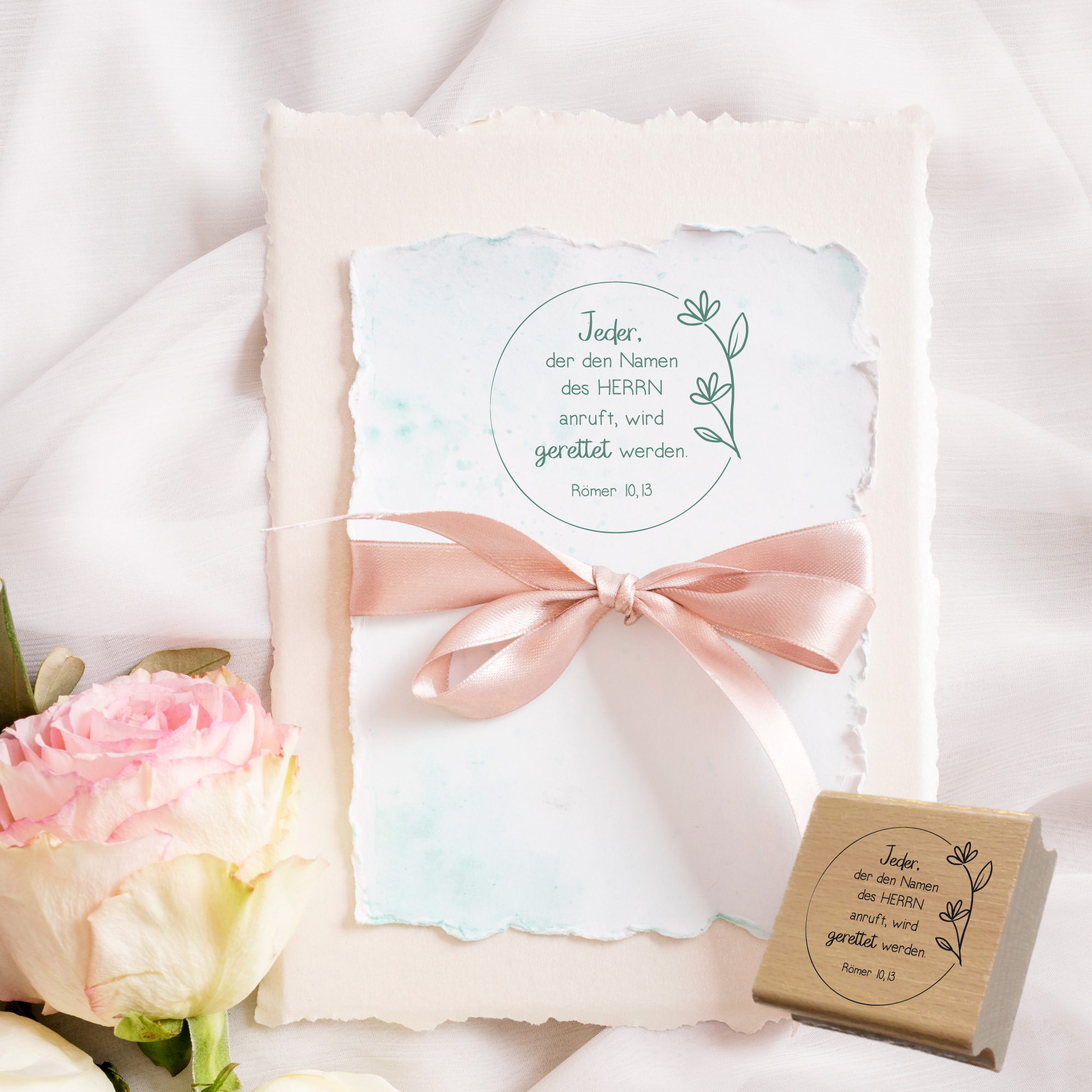 Mit unserem Bibelstempel „Römer 10,13“ gestaltest du Karten, Geschenke, Einladungen und Journals mit einer liebevollen, evangelistischen Botschaft:
